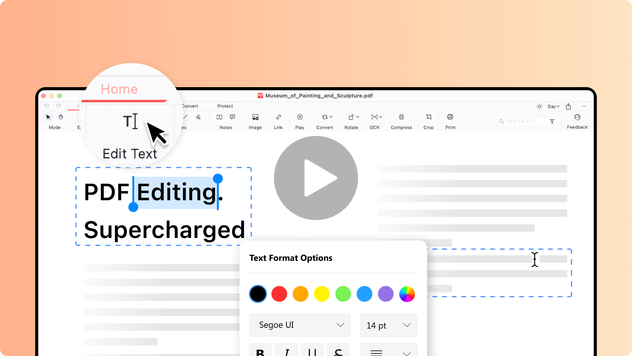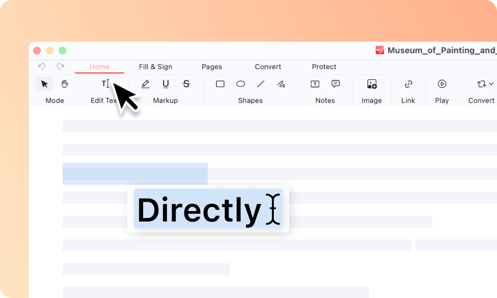 Instantly select text in PDF and make edits as if working with Microsoft Word, without inserting text boxes. You can freely replace text, insert text, delete text, move text, rearrange letter orders, change fonts/typefaces, and more.