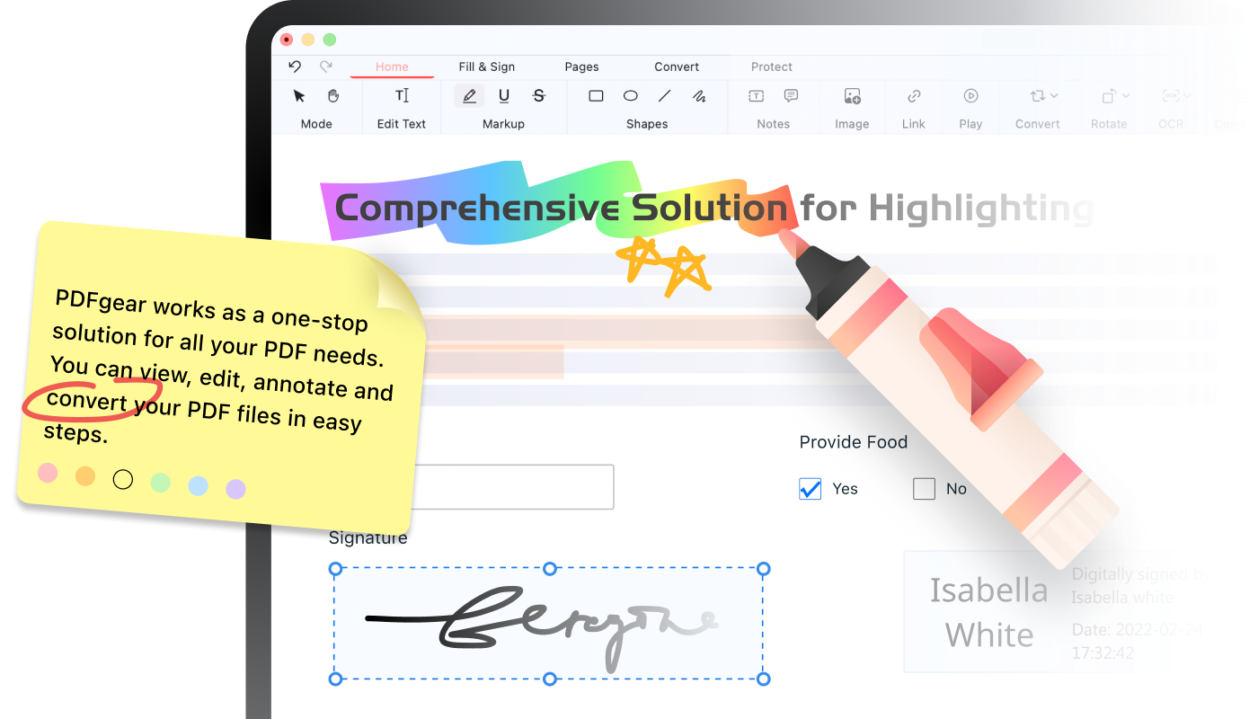 Neben dem Markieren von Text und Bereichen in PDF-Dokumenten bietet PDFgear for Desktop & Mobile eine Vielzahl von Anmerkungsoptionen wie Notize, Kommentare, Signaturen, Formulare und vieles mehr.